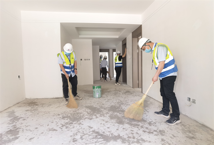 裝飾公司雄安容西B3標段項目部組織項目青年職工拿著掃帚、抹布、水桶進行室內衛生清理,現場青年職工們斗志昂揚,場面熱火朝天,共同為6月30日的全面交付努力奮斗。